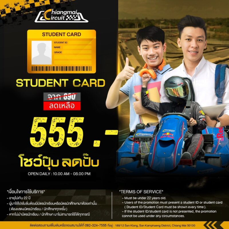 เมื่อแสดงบัตรนักเรียน /นักศึกษา ลดทันทีจากราคาปกติ 690.- เหลือ 555.- เท่านั้น ห้องเรียนไม่ได้สอนทุกอย่าง ให้ความเร็วเยียวยาใจ เชียงใหม่เซอร์กิต ขอมอบสิทธิพิเศษมากมายเพื่อการเรียนรู้อย่าลืมชวนเพื่อนมาใช้สิทธิ์กันนะ โปรโมชันตั้งแต่วันนี้เป็นต้นไป